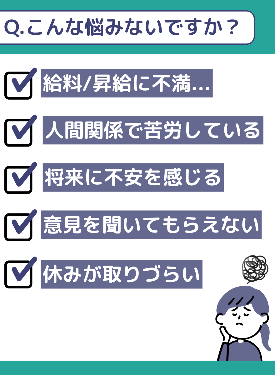 A.もちろん相談できます!一緒に考えて、進めていきましょう!同じようなお悩みを持っている方からの、転職・就職相談は多いので、漠然としていても大丈夫です。