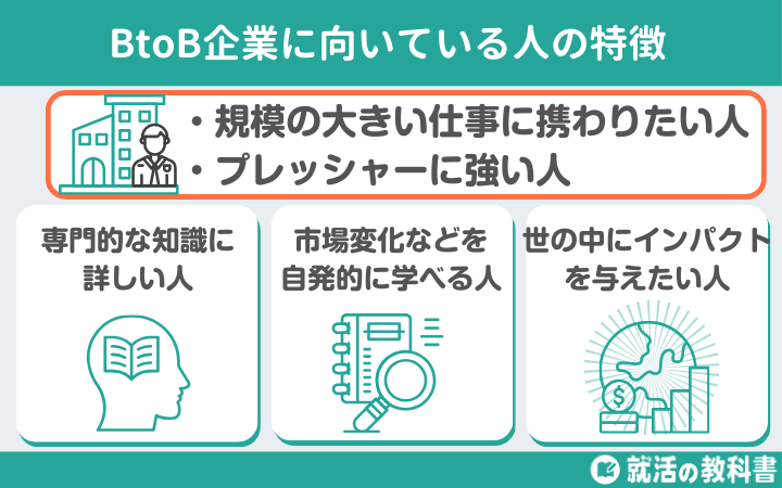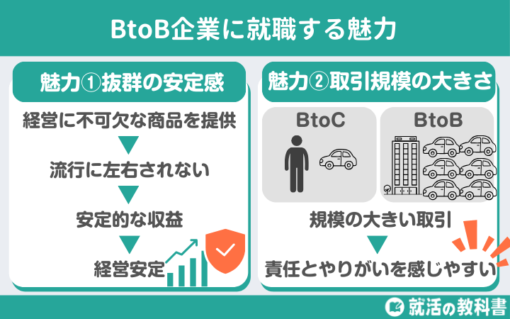 BtoB企業は、経営が安定しているためリストラなどのリスクが低く、取引の規模が大きいため責任とやりがいを感じやすい、といった特徴があります。