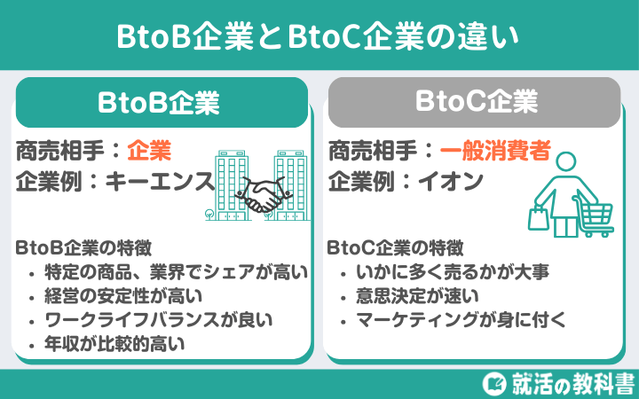 合わせて、BtoB企業とBtoC企業の違い、BtoB企業の探し方、BtoB企業に就職するメリット・デメリットについて解説していきます。