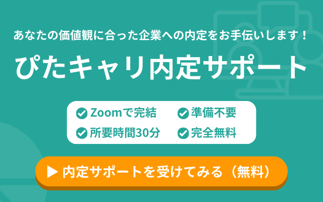 「ぴたキャリ内定サポート(無料)」は、元リクルートや人事経験のある就活のプロが、あなたの価値観にあった企業求人を持つエージェントを見つけ、内定までサポートします!