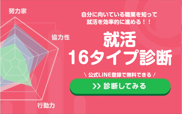 ⇒ 「就活16タイプ診断」を無料で受け取る(現在の登録者:333,762人)
