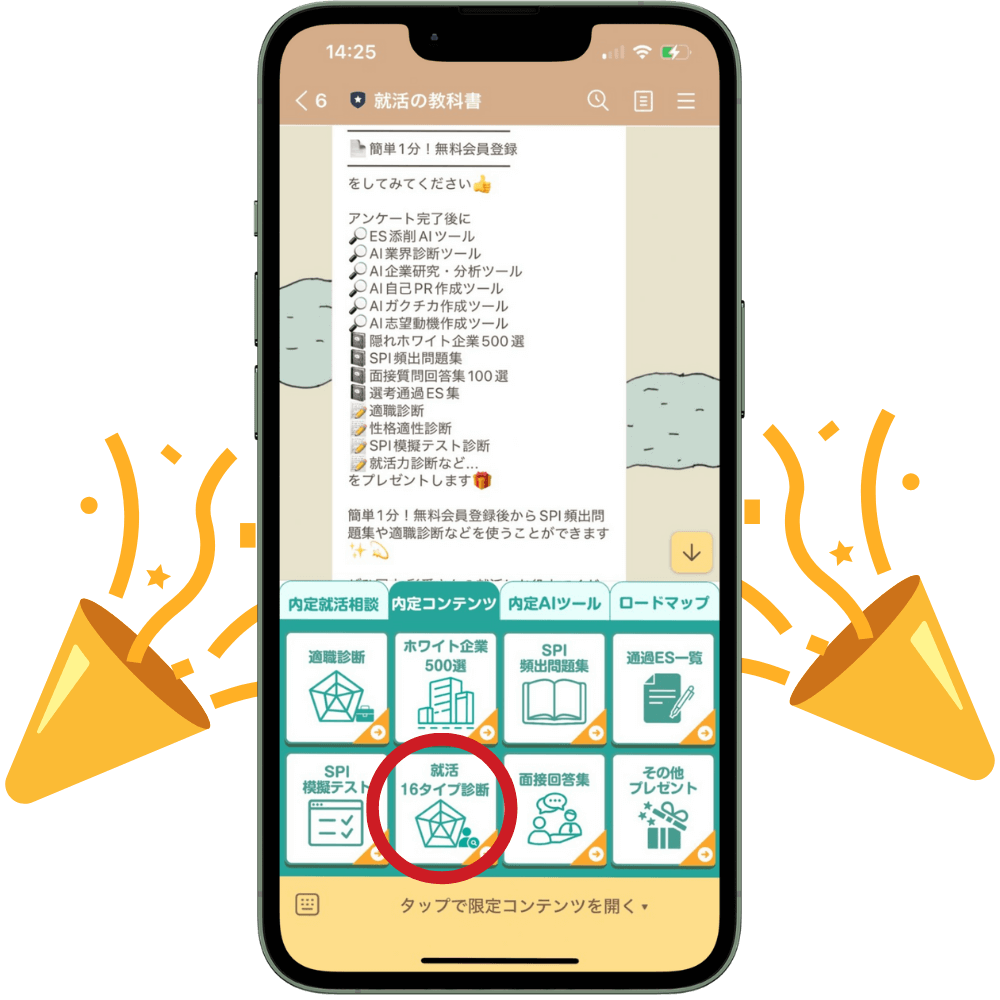 「公式LINE」(就活の教科書が運営、登録者33万人以上)に登録すると、「就活16タイプ診断」を含む限定プレゼントが届きます。