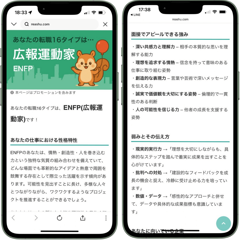 でも「転職16タイプ診断(無料)」なら、向いている職業や企業タイプだけじゃなくて、あなたの強みや弱みも明確に言語化してくれるから、とても役立つよ!