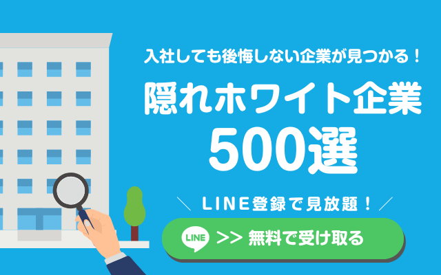 隠れホワイト企業500選なら、上記の内容をより詳しく紹介しています。自分で探す方法も伝授しているので迷った方はまずはこのリストを受け取ってみてください!