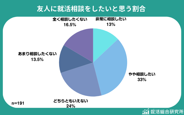 就活相談を友人に「非常に相談したい」(13.0%)と「やや相談したい」(33.0%)と答えた就活生はあわせて46.0%でした。