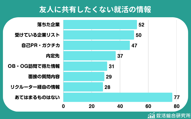 友人に共有したくない就活の情報は「落ちた企業」(52人)が最多でした。