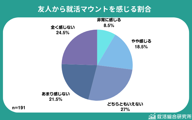 友人から就活マウントを「非常に感じる」(8.5%)と「やや感じる」(18.5%)と答えた就活生はあわせて27.0%でした。約3割の学生が友人との会話の中で何らかの劣等感や比較を感じた経験があることがわかります。