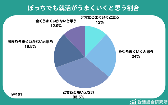 ぼっちでも就活が「非常にうまくいくと思う」(12.0%)、「ややうまくいくと思う」(24.0%)と答えた就活生はあわせて36.0%でした。就活生の3割が、個人の努力で就活を乗り越えられると考えていることがわかります。