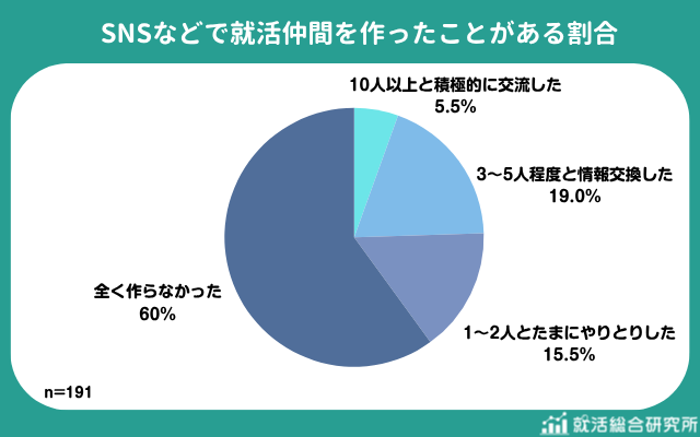 SNSなどで「10人以上と積極的に交流した」(5.5%)、「3〜5人程度と情報交換した」(19.0%)、「1〜2人とたまにやりとりした」(15.5%)と回答した就活生は40.0%でした。SNSが就活ネットワークの場として定着しつつあることが明らかになりました。