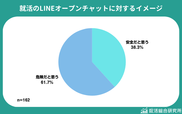 就活生の61.7%がLINEオープンチャットを「危険」と回答し、安全だと感じている38.3%を大きく上回りました。リスクへの警戒感が強く、就活生の間で慎重な姿勢が見られます。