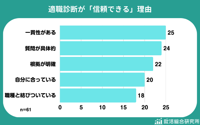 適職診断が「信頼できる」と感じる理由として最も多かったのは「一貫性がある(25人)」で、質問内容と結果の整合性が評価されていました。