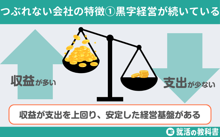 黒字経営が続いていることは、つぶれない会社の大切な特徴なんですね!